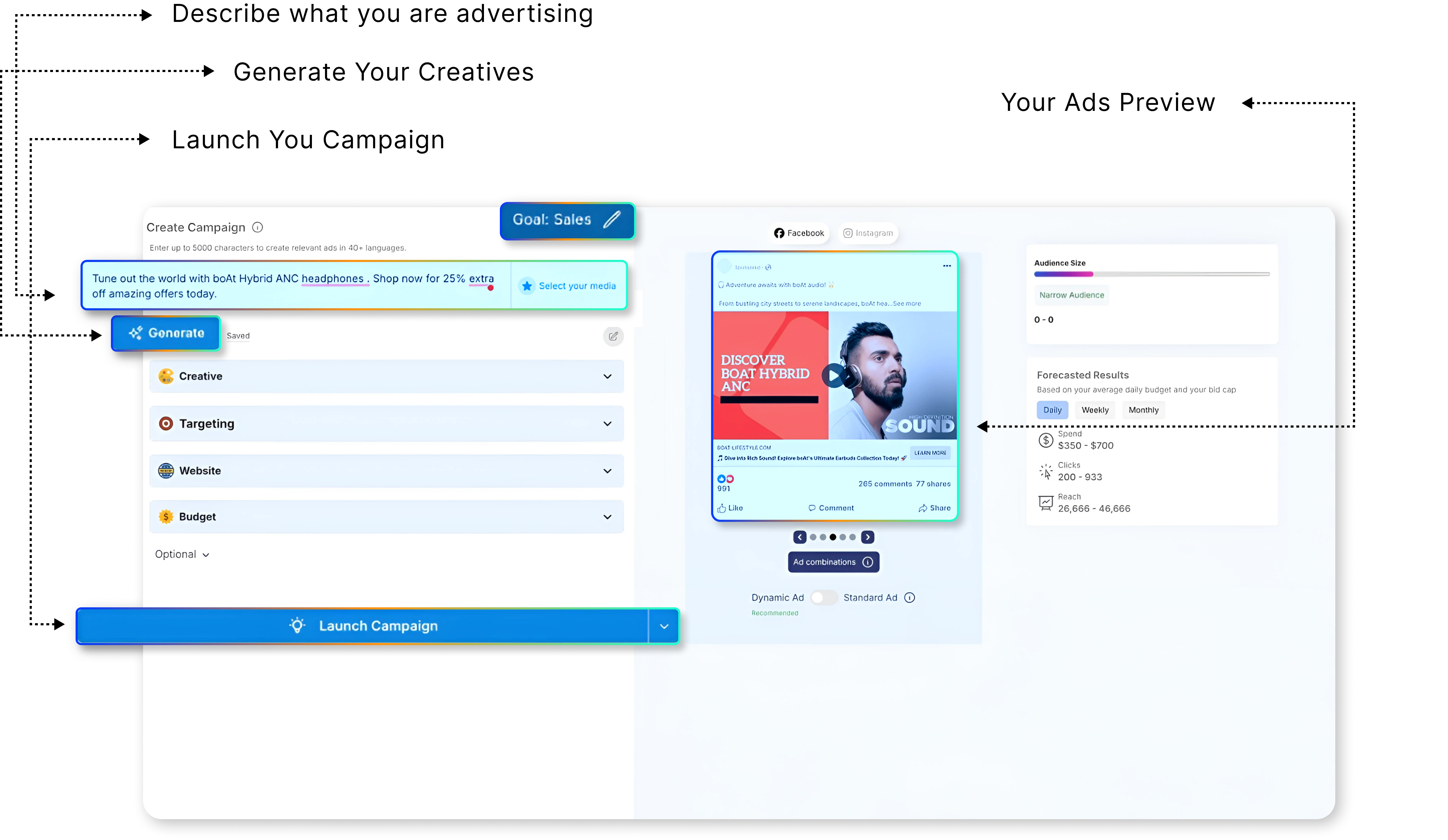Generate sales focused texts and headlines tailored to the platform you advertise on and let our Artificial Intelligence be your copy-writer so you can focus on what really matters your business.